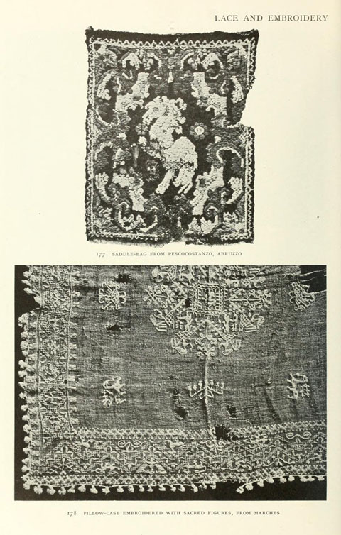 Marche, Italy | Date: 1913 | Notes: The image was taken from the book, "Peasant Art in Italy," edited by Charles Holme (Lond: The Studio Ltd., 1913). Photo caption: "Pillow case embroidered with sacred figures from Marches." For the complete copyright-free text visit www.archive.org. | Contributed by: Courtesy of www.archive.org