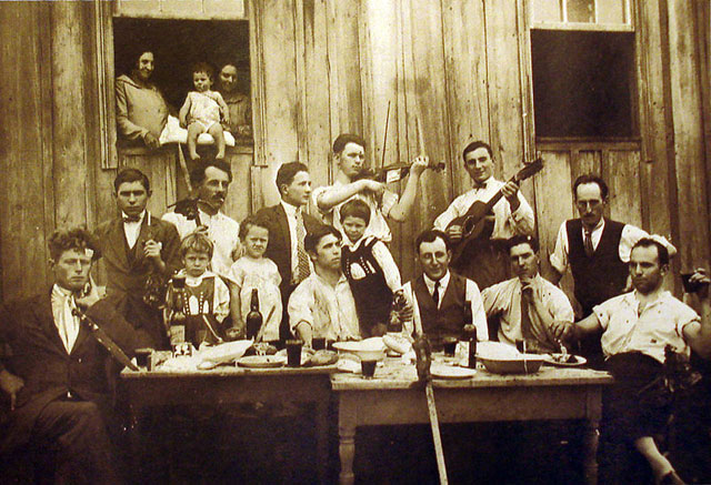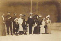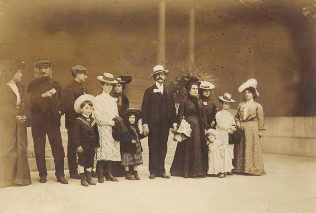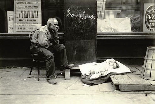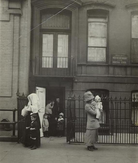 Notes: A note written on the verso of the photo reads:" Factory workers. Working mothers leaving day nursery with their children. Familiar West Side types: girl-mother at right; the widow at the doorway, and the Italian factory worker at left. New York City."