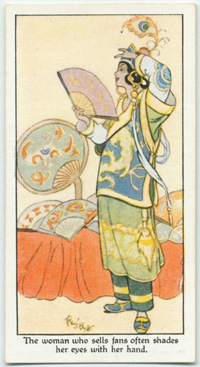 o "The woman who sells fans often shades her eyes with her hand."