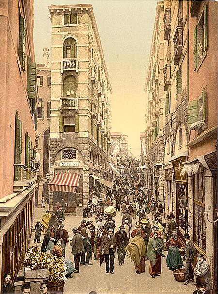 Venice, Italy | Date: ca. 1890 - 1900 | Notes: "Street near the Rialto, Venice, Italy." Digital ID: 06702. | Contributed by: Courtesy of the Library of Congress, PPOC