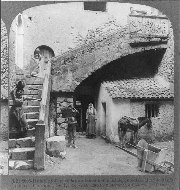 Taormina, Sicily, Italy | Date: c1906 | Notes: "Humble folk of today and their home inside a mediaeval nobleman's palace." Digital ID: 3b21016. | Contributed by: Courtesy of the Library of Congress
