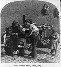 Rome, Italy | Date: ca 1900 | Notes: Title: "A street scene, Rome, Italy." Summary: "Woman, boy and girl around portable stove; baskets of fruit and nuts (?) behind them." Digital No. 3b20818. | Contributed by: Courtesy of the Library of Congress, PPOC