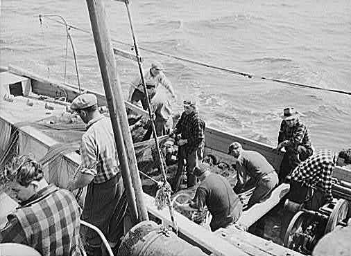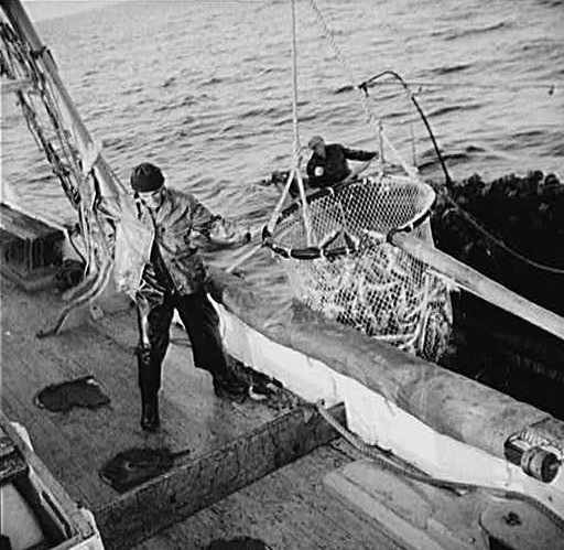 Gloucester, Massachusetts, U.S.A. | Date: June 1943 | Notes: "Francesco Parisi, youngest member of the Alden's crew, motioning for the skipper to hoist the large dip net over the side." Digital ID: 8d30580. | Contributed by: Courtesy of The Library of Congress