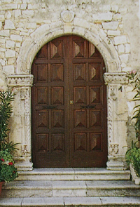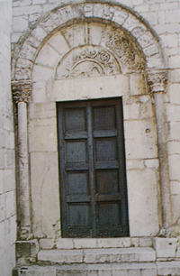 Castropignano, Molise | Date: Current | Notes: Chiesa di san Salvatore. "Sui monti che sorvegliano dall'alto la vallata del Biferno si registra un' assonanza formale ed iconografica tra i portali delle chiese di San Salvatore e di Santa Maria del Giardino, rispettivamente a Castropignano e a Casalciprano. Il primo presenta un arco a tutto sesto, che parte da capitelli decorati con elementi vegetali, con cornice a tortiglione alla base della quale, a sinistra, vi e una protome umana. Il secondo e simile al primo, con la variante di due cherubini, a destra e sinistra, all'inizio della cornice. Entrambi i portali sono assegnabili al XIII-XIV secolo." From tourist brochure: "L'Arte Romanica" published by Edizioni Enme. Photo: Mauro Pesutti. | Contributed by: Courtesy of Regione Molise Assessorato al Turismo