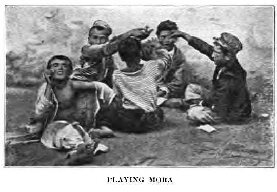 Naples, Campania, Italy | Date: 1908 | Notes: The image was taken from the book, "Pappina, the Little Wanderer, a Story of Southern Italy," by Katherine Wallace Davis (Chicago: A. Flanagan Company, 1908). Caption: Playing mora. | Contributed by: Courtesy of www.archive.org