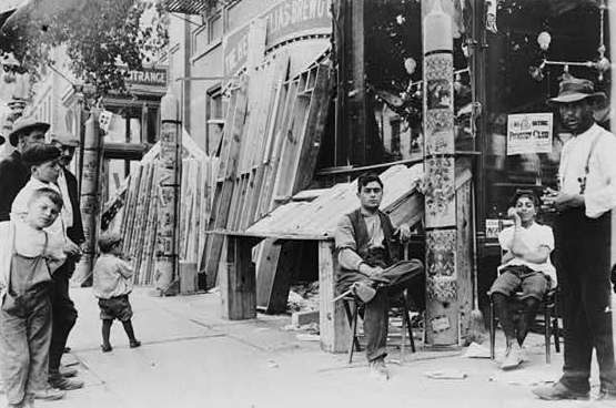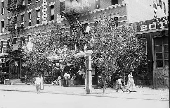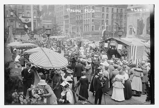 Little Italy, New York City | Date: 1908 | Notes: Summary: "Men and boys on sidewalk outside of store, at festival in Little Italy, New York City." Digital ID: 3c14764. | Contributed by: Courtesy of the Library of Congress