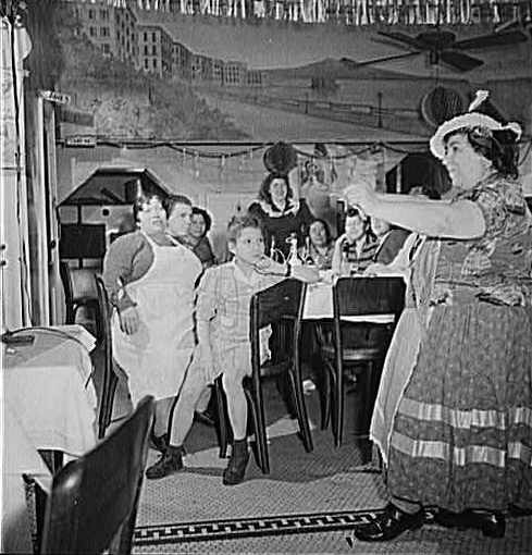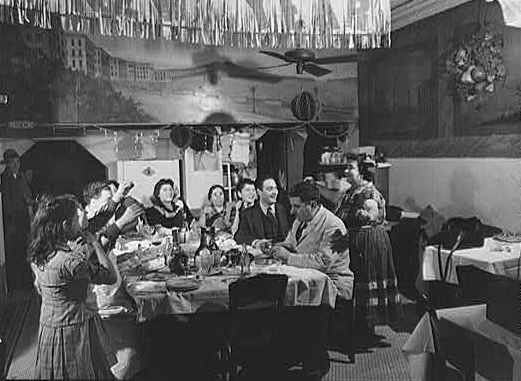 Notes: "The Di Costanzo family, owners of a restaurant on Mulberry Street, hold their annual family dinner in the restaurant on New Year's Eve. Gypsy friend who comes to eat, dances toentertain them." Photo: Marjory Collins. Digital ID: 8d11652.