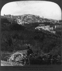 Perugia, Umbria, Italy | Date: 1903 | Notes: "Perugia, the picturesque hillside city of central Italy." Summary: "Man with mule-drawn cart in foreground; city in background." Digital ID: 3b20821. | Contributed by: Courtesy of the Library of Congress