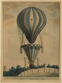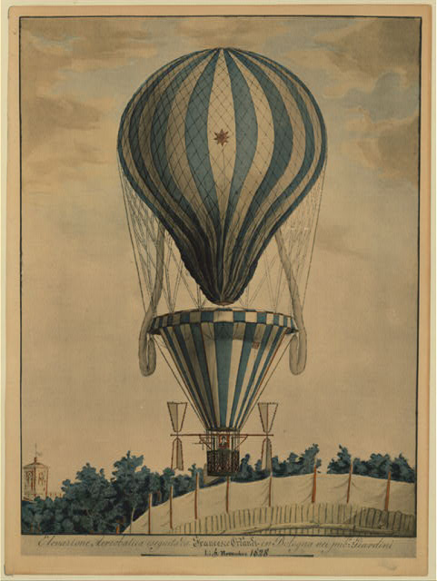 Bologna, Italy | Date: November 6 1828 | Notes: "Print shows the balloon of Francesco Orlandi ascending over the public gardens of Bologna, Italy." Subjects: Balloons (Aircraft) -- Italy -- Bologna -- 1820-1830." Digital ID: 02458. | Contributed by: Courtesy of the Library of Congress