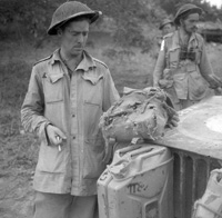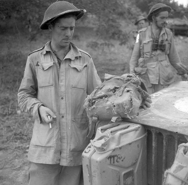 Campobasso, Molise, Italy | Date: October 1943 | Notes: "Pte. P. Jacques of Le Royal 22e Regiment looking at his shrapnel-riddled backpack, near Campobasso, Italy, October 1943." | Contributed by: Courtesy of Lieut. Alexander M. Stirton/ Canada. Dept. of National Defence/ Library and Archives Canada/ PA-115196