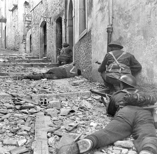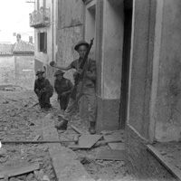 Campochiaro, Molise, Italy | Date: October 23 1943 | Notes: "Soldiers of the 3rd Canadian Infantry Brigade run into snipers and machine gun fire, Campochiaro, Italy, 23 October 1943." | Contributed by: Courtesy of Lieut. Alexander Mackenzie Stirton/ Canada. Dept. National Defence / Library and Archives Canada/ PA-129774
