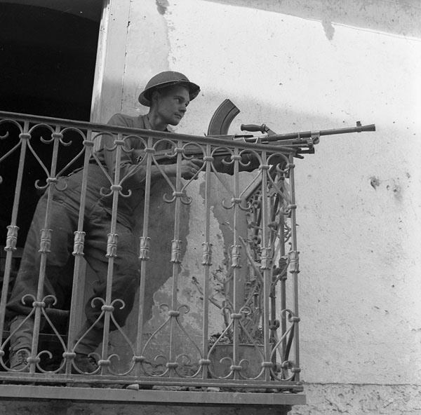 Campochiaro, Molise, Italy | Date: October 23 1943 | Notes: "Infantrymen of The Carleton and York Regiment preparing to lob a hand grenade into a sniper's hideout, Campochiaro, Italy, 23 October 1943." | Contributed by: Courtesy of Lieut. Alexander M. Stirton/ Canada. Dept. of National Defence/ Library and Archives Canada/ PA-136198