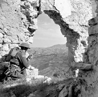 Colle d'Anchise, Molise, Italy | Date: October 26, 1943 | Notes: "Private M.D. White of The Loyal Edmonton Regiment observing from a defensive position, Colle d'Anchise, Italy, 26 October 1943." | Contributed by: Courtesy of Lieut. Terry F. Rowe/ Canada. Dept. of National Defence / Library and Archives Canada/ PA-141867