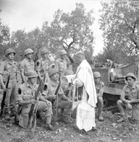 Italy | Date: October 1943 | Notes: "Infantrymen of the Royal 22e Regiment receiving Holy Communion from the unit's chaplain, H/Major Leo Grattan, before going on a reconnaissance patrol, Italy, October 1943." | Contributed by: Courtesy of Lieut. Alex M. Stirton/ Canada. Dept. of National Defence/ Library and Archives Canada/ PA-190295