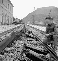 Carovilli, Molise, Italy | Date: November 26 1943 | Notes: "Sergeant F.H.J. Ricketts examining railway ties which were cut by the last German train through Carovilli, Italy, 26 November 1943." | Contributed by: Courtesy of Lieut. F. G. Whitcome/ Canada. Dept. of National Defence/ Library and Archives Canada/ PA-206523