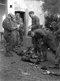 San Leonardo di Ortona, Abruzzo, Italy | Date: December 10 1943 | Notes: "Infantrymen of The Seaforth Highlanders of Canada carrying a comrade who was killed by shellfire while escorting German prisoners, San Leonardo di Ortona, Italy, 10 December 1943." | Contributed by: Courtesy of Lieut. Frederick G. Whitcombe/ Canada. Dept. of National Defence/ Library and Archives Canada/ PA-167912
