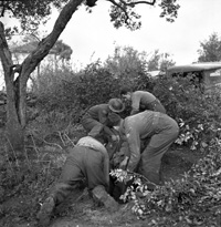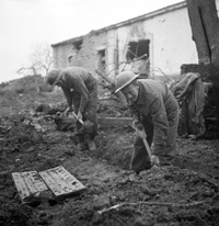 San Leonardo di Ortona, Abrruzzo, Italy | Date: December 10 1943 | Notes: "Privates J. Miller and W.H. Hall, both of The 48th Highlanders of Canada, digging a slit trench during a pause in a German counter-attack, San Leonardo di Ortona, Italy, 10 December 1943." | Contributed by: Courtesy of Lieut. Frederick G. Whitcome/ Canada. Dept. of National Defence/ Library and Archives Canada/ PA-167658