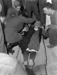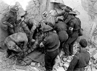 Ortona, Abruzzo, Italy | Date: December 21, 1943 | Notes: "First-aid personnel of the Three Rivers Regiment placing Sergeant Johnny Marchand on a stretcher, Ortona, Italy, 21 December 1943." | Contributed by: Courtesy of Lieut. Terry F. Rowe/ Canada. Dept. of National Defence/ Library and Archives Canada/ PA-163927