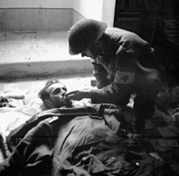 Catono, Calabria, Italy | Date: December 21 1943 | Notes: "Private B.D. Flynn of the Regimental Aid Party, The Seaforth Highlanders of Canada, giving a drink of water to a badly-wounded German prisoner inside a church, Catona, Italy, 21 December 1943." | Contributed by: Courtesy of Terry F. Rowe/ Canada. Dept. of National Defence/ Library and Archives Canada/ PA-141670