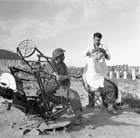 Ortona, Abruzzo, Italy | Date: January 10 1944 | Notes: "Signore Tomasso, an Italian barber, cuts the hair of Private R.J. Tims of the Anti-Aircraft Support Company, Saskatoon Light Infantry (M.G.), watched by Private Tommy Bear, Ortona, Italy, 10 January 1944." | Contributed by: Courtesy of Capt. Alex M. Stirton/ Canada. Dept. of National Defence/ Library and Archives Canada/ PA-177097