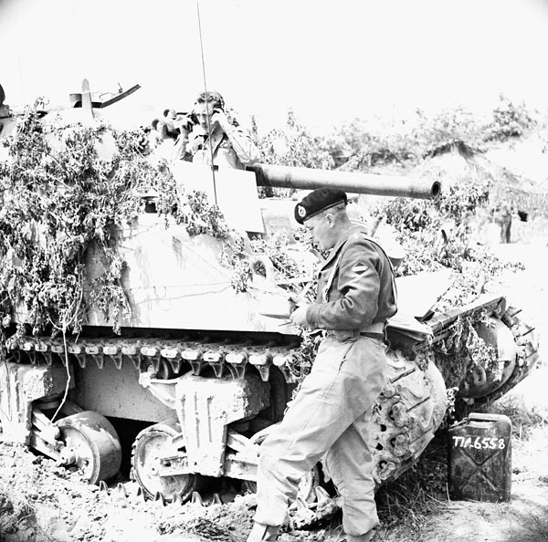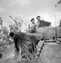 Italy | Date: May 23, 1944 | Notes: "Lieutenant R.O. Campbell (left) of the Canadian Army Film and Photo Unit and Corporal H.H. Mowbray with a movie camera mounted on the turret of a Sherman tank near the Hitler Line, Italy, 23 May, 1944." | Contributed by: Courtesy of :Lieut. Strathy E.E. Smith/ Canada. Dept. of National Defence/ Library and Archives Canada/ PA-140097