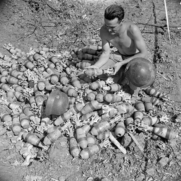 Aquino, Lazio, Italy | Date: May 22, 1944 | Notes: "Private J.O. Hayman examining a heap of Italian-made mortar bombs abandoned by a German Panzer Grenadier unit near Aquino, Italy, 22 May 1944." | Contributed by: Courtesy of Capt. Alex M. Stirton/ Canada. Dept. of National Defence/ Library and Archives Canada/ PA-205119