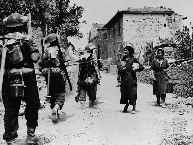 San Pancrazio, Puglia, Italy | Date: July 16, 1944 | Notes: "Canadian troops enter village where the previous week German soldiers had massacred the male inhabitants." | Contributed by: Courtesy of Alexander M. Stirton/ Canada. Dept. of National Defence/ Library and Archives Canada/ PA-129763