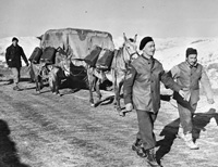Italy | Date: 27 February 1945 | Notes: "Quartermaster Sergeant F.C. Nelson, Three Rivers Regiment, and an Italian muleteer leading a mule pack team along a snow-covered mountain road, Italy, 27 February 1945." | Contributed by: Courtesy of Lieut. Alex M. Stirton/ Canada. Dept. of National Defence/ Library and Archives Canada/ PA-171189