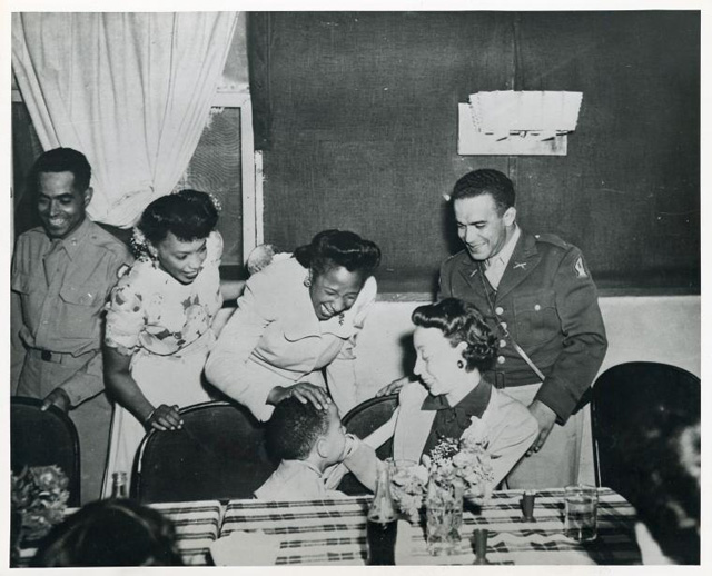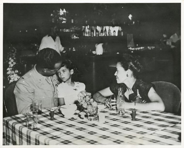 Leghorn, Italy | Date: 1946 | Notes: "First Lieutenant and Mrs. Edward Mitchell, 876 Rockdale Avenue, Cincinnati, Ohio, and daughter Janice Althea, are shown at dinner given at Leghorn, Italy, for dependents who arrived on June 3 aboard the SS Thomas Barry; Lieutenant Mitchell is one of the 2,500 Negro officers and enlisted men stationed on the Italian peninsula." | Contributed by: Courtesy of the New York Public Library, Digital Gallery/ 1260270