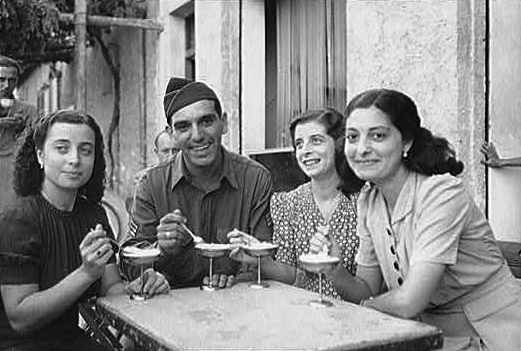 Palermo, Sicily, Italy | Date: Sept.? 1943 | Notes: "One American soldier who found his relatives in Sicily was Vincent J. Orivello of Milwaukee, Wisconsin, eating ice-cream at a sidewalk cafe in Palermo with three of his cousins." Digital ID: 8d34225. | Contributed by: Courtesy of the Library of Congress