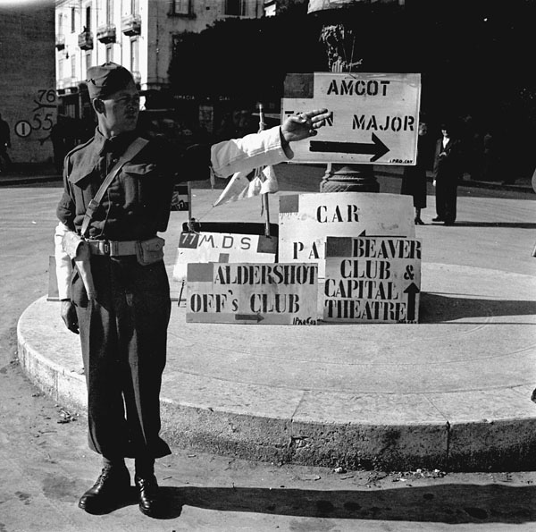 Campobasso, Molise, Italy | Date: October 21 1943 | Notes: "Lance-Corporal D.G. Stackhouse, Royal Canadian Mounted Police (R.C.M.P.), directing traffic, Campobasso, Italy, 21 october 1943." | Contributed by: Courtesy of Lieut. Jack H. Smith / Canada. Dept. of National Defence / Library and Archives PA-213689
