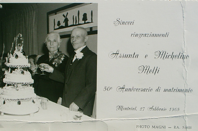 Montreal, Quebec, Canada | Date: 1965 | Notes: The contributor's paternal grandparents visited Canada in 1965 to celebrate their 50th wedding anniversary. Her nonni's four children managed to save enough money to pay for their tickets (Quite a feat in those days). Nonna Assunta and Nonno Michele were not impressed with Canada --the country was far too cold for their taste. They couldn't wait to go back to Italy. While Nonna Assunta and Nonna Michelino had a good marriage, not all couples in Italy who made it to their 50th anniversary were as lucky. Prior to 1970 it was against the law in Italy to get divorced. Not only did the Catholic Church forbid it, but so did Italian government. In 1970, not only did Italy's marriage laws change, but so did everything else. The mass migration of Italians (over 25 million Italians left the country of their birth after World War II), had a huge impact on both those who left their native country and those who stayed behind. In 1970 Italy became a mirror image of North America. The "old country" ceased to be, or so thinks this contributor. | Contributed by: Mary Melfi