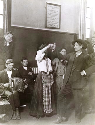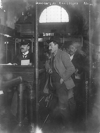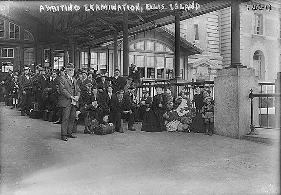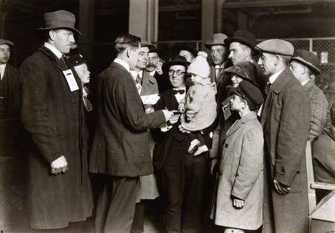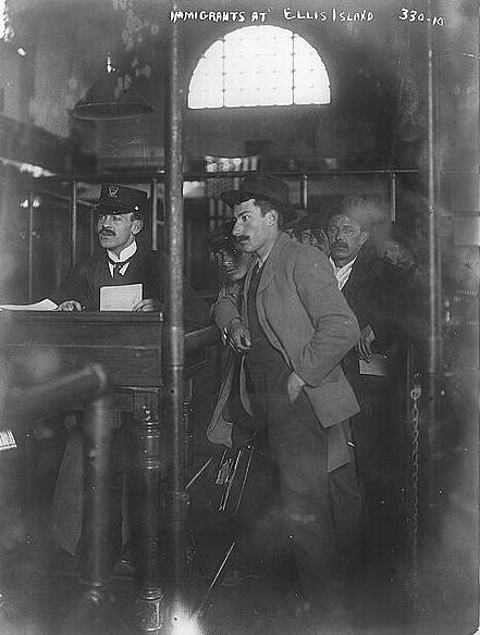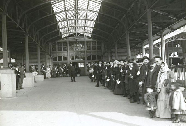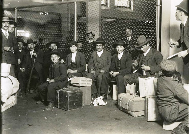 Ellis Island (N.Y. and N.J.) U.S.A. | Date: 1905 | Notes: Lewis W. Hine's photo-study is titled, "Group of Italians in the railroad waiting room." A note attached to the photo-study reads: "These are some of the Italians who became the barbers, waiters, chauffeurs and mayors of America. Some became the artists and sculptors of our national Capitol and of other public buildings." | Contributed by: Courtesy of the New York Public Library, Digital Gallery