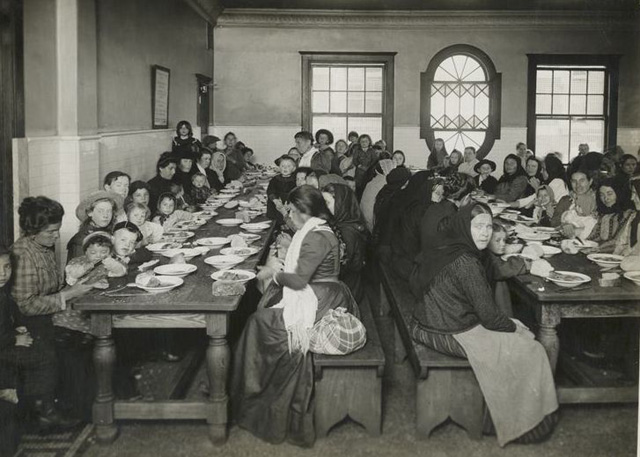 Ellis Island (N.Y. and N.J.) U.S.A. | Date: ca. 1902-1913 | Notes: The photo was taken by Edwin Levick; its image caption reads: "Uncle Same, host. Immigrants being served a free meal at Ellis Island." | Contributed by: Courtesy of The New York Public Library, Digital Gallery