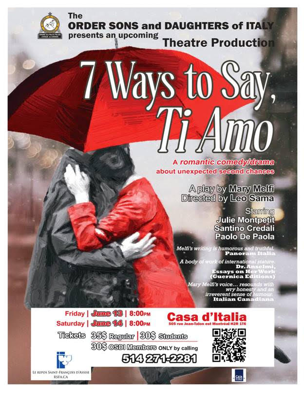 7 Ways to Say, Ti Amo, a romantic comedy/drama about unexpected second chances, written by Mary Melfi, directed by Leo Sama and produced by The Order of the Sons and Daughters of Italy in Montreal premiered at the Casa d’Italia on June 13th and June 14th 2025 to a sold-out audience. The cast included Julie Montpetit as Tina De Luca, Santino Credali as Francesco Marino and Paolo De Paola as Tom Dixon.  Angela Federici was responsible for the costumes & accessories; Joe Ribuffo & Joe Fratino, the set, Sonia Faoro, public relations & marketing, and Jullien Boivert Blot, lights & sound.
