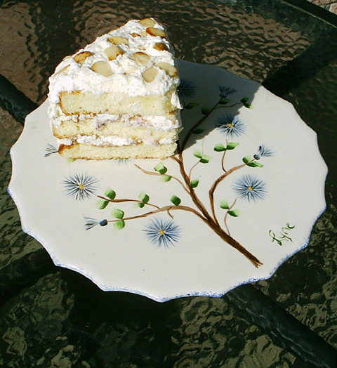 Notes Of all the three-layered cakes I had the pleasure to make in my long life, this has to be my favorite, no ifs or buts. The combination of sugared ricotta and almond extract is pure genius. Thank God for Sicilian desserts! They have miraculous properties -- one bite and one is in heaven! P.S. Most traditional recipes for this type of cake generally do not include baking powder, but I found that it is useful -- it acts as a guarantee that the batter will rise in volume (It probably will anyway, as there are a lot of eggs, but it's nice not to have to worry about it). Also, some recipes call for grated chocolate to be added to the ricotta mixture, while others might omit the chocolate, and include a touch of vanilla. Nowadays, frostings for "Cassata Alla Siciliana" vary, but I believe the original way of presenting this cake was to top it with a frosting made with egg whites, icing sugar and lemon juice (For such a recipe see Italy Revisited/"Puddings and Creams"). Personally, I find frostings made with egg whites too complicated and time consuming as one has to first beat the egg whites till stiff, and then cook the beaten egg whites and icing sugar over a double boiler. However, if one wants to go the traditional route, it's best to use an egg-white frosting. Professional pastry chefs might also decorate the egg-white frosting with glazed fruits. That said, this cake does not need much embellishment for it to be guest-worthy. It gets most of its flavor from its almond and lemon-flavored base -- a truly lovely sponge cake.... Photo and notes: Mary Melfi. |