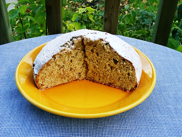 Place on middle rack and bake in a 350 degree oven for about 50 minutes or so (The cake is ready when a thin skewer stuck in the middle comes out clean).