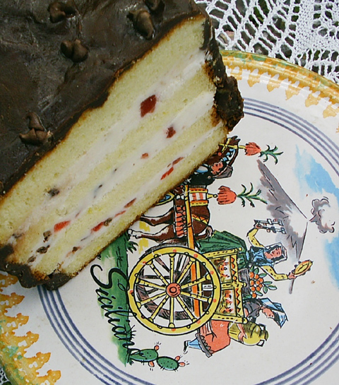 The cake shown in this entry was made by the lady who took its photo, Mary Melfi, following Rita Ferrara's recipe... well, almost following it. This Mary did not use a "pound cake mix" but rather a ciambella mix (Actually, I used Rita Palazzo's Molisani lemon-flavored "Ciambella" cake recipe which can be found in this category). Also I didn't add any coffee to the chocolate frosting, worried it might make the frosting bitter (O.K., it's well-known in culinary circles that Sicilians make use of a lot more than 1/4 cup espresso coffee in their chocolate frosting with no ill-effects, but I couldn't bring myself to do it). In any case, the cake that was made following more or less the recipe in this entry was quite superb. Sicilians do have the edge when it comes to making desserts.... Photo and notes: Mary Melfi. |