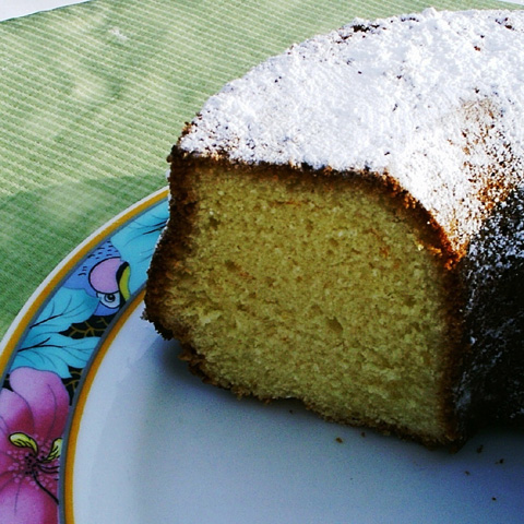 Pour batter into a 12-inch cake pan, and bake in a moderate oven (350 degrees F) about 45 minutes. When baked, invert on rack to cool.