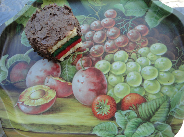 Pull the ends of the sponge cake over the strips and form a roll, which when sliced shows a checkerboard of various colors. For family use this recipe can be simplified. Use only half of the ingredients.