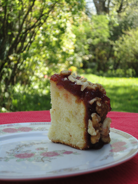 Directions Have ready six sponge cakes, tall and round, like tarts, coop out the centers, and roll the outsides in jam, then in chopped nuts.