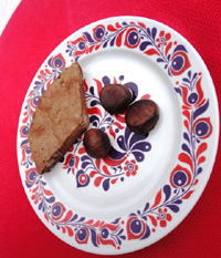 Prendete grammi 500 di farina di castagne e sicomme questa farina si appasta facilmente, passatela dal setaccio prima di adoperarala per renderla sofice; poi mettetela in un recipiente e conditela con uno scarso piszzico d sale. Fatto questo, intrdetela con 8 decilitri di acqua diaccia versata a poco per volta conde riduria una liquida farinate. Per ultimo gettate nella medesima un pugno di pinoli interi. Alcuni aggiungono ai pinoli delle noci a pezzetti ed altri anche dell uva secca. Ora prendte una teglia ove il migliaccio vengagrosso un dito e mezzo all incirca, copritene il fondo con un leggiero strato d olio, ed altr olio, due cuchiaiate, spargetelo sulla farinata quando e nella teglia. Cuocetelo in forno o anche in casa fra due fuochi e sformatelo caldo. Con questa farinata si possono fare anche della frittelle.