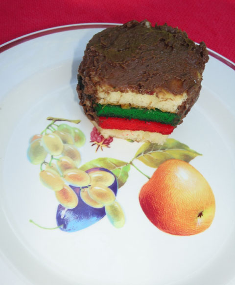 Remove from oven, and while the cake is still hot cut into a sufficient number of strips two centimeters wide and as long as the remaining piece of sponge cake, for which they will be used as filling. But to give these strips a nice appearance, they should be different colors. So sprinkle some of them with white rosolio, and they'll turn yellow; others with alkermes, and they will turn red; dye the last ones black with white rosolio marinated with chocolate.