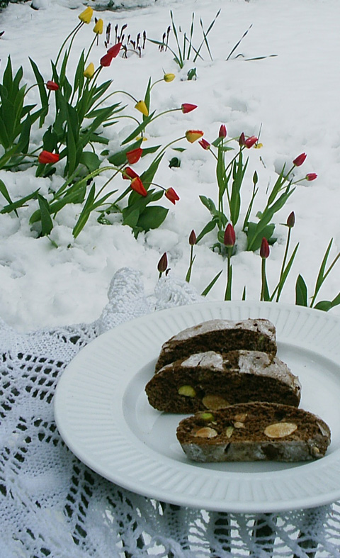 o Place the sliced cantuccini on the cookie sheets, in the same position as were the original logs (Do NOT flip the slices over, but let the cookies stand up). Leave enough space between the slices so they will be evenly re-baked.