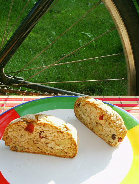 Rita Ferrara's vegan-style biscotti (some vegans allow for honey in their diet, others do not) are less sweet than the average Tuscan biscotti. Nonetheless, they are relatively easy to do and taste quite good. As dried cherries are sweeter than cranberries they will help make the cookie sweeter if used, but as they are also incredibly expensive, using cranberries makes this recipe a lot more economical. Currants can also be used as a substitute for cranberries, and increase sweetness if desired, but then, of course, the biscotti will not look as pretty without that dash of red color. Photo and notes: Mary Melfi. |