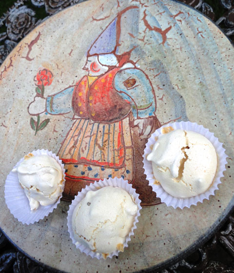 Notes Molise's famous "bianca neve" cookies are never easy to make. Sometimes they come out alright, and sometimes the inside of the cookies is mushy, or the exterior of the cookies gets browned. The good news is that the cookies are not expected to have a uniform round shape, nor are they expected to have a smooth surface. The charm of these cookies comes from the fact that they don't all look alike. The cookies are expected to open up a little and appear cracked. These cookies are not like your average French-style meringue almond cookies whose centers are soft, these cookies are hard to the touch, and when eaten, break up into tiny hard pieces. Many Molisani who grew up on this treat love these cookies precisely because they are not soft, but others who are used to French-style ones, don't like them at all for this same reason. As noted "Bianca Neve" cookies are difficult to make because they are supposed to get hard, but they are not supposed to get browned. The name of the cookie, after all is "bianca neve" meaning as white as snow. Prior to World War II they were generally only served at weddings and First Holy Communions, and that's one of the reason the color of the cookies mattered (The bride back then did wear white, as those who made their First Holy Communions). Because I associate "bianca neve" with special events from my eary childhood, I have a strong attachment to them. My late aunt, Zia Teresa, was the one whose task was to make these cookies. I have fond memories of her making these cookies on Chabot street in Montreal; in the early 1960s she did not yet own an egg beater so she beat the egg whites and sugar by hand -- the process took about an hour. She used two forks to beat the eggs and sugar, and then to test if the stiff mountain peak had been achieved she placed one of the forks in the center. If the fork did not fall but stayed inside the bowl upright, then the egg whites and sugar were beaten properly. Also, back then, one could not buy blanched slivered almonds, so she boiled the raw almonds in water for a few minutes and then removed the skin with a napkin, adding, I guess, another 1/2 to the process. After that she had to cut the almonds; as there were no electric choppers, she quartered the nuts with a knife. Making these cookies took a whole afternoon, with or without the help from other family members. In any case as "bianca neve" are my favorite cookies on the planet, earth, I have tried different versions -- the ingredients are always the same: egg whites, roasted almonds and sugar, but I tried varying the amount of ingredients used. Sometimes changing the proportions doesn't make much difference, and sometimes it does. I never had to throw out the cookies I made (Sugar & roasted almonds are good any which way, but sometimes I couldn't offer them to guests). In any case I can't say which version of the two presented in this entry is better. Both recipes seem, on the most part, to produce a good Molisani almond cookie. Making them in paper baking cups is always a good idea regardless of what version of the recipe one uses. Making the cookies as small as possible (using 1 teaspoon of batter per paper cup) can also help guarantee success as then the cookies need less baking time -- the only problem with the bite-sized version of these cookies is that they don't look all that nice (They look more like candy balls than almond cookies). If one is lucky, one gets the right-sized cookie with the right taste. North American cooks might argue luck has nothing to do with it. It's all about getting the right recipe and following the instructions to the letter. Well, I beg to differ, as sometimes the exact same recipe comes out just fine, and sometimes it doesn't. Possibly my aunts were right -- it all depends on the weather. That's the one factor that one has no control over, unless, of course, one is making the cookies at some factory where weather is not an issue. Then again factory-made cookies have a lot of additives, so maybe it's not the fact that factory chefs can control the temperature in the room, but that they have the option to enhance or imitate flavors. Home cooks also have the option of adding flavors, but at least, they also can (if they are lucky enough to have the funds for it) opt for "natural" products. Natural flavors cost a fortune, and whether they are worth it is hard to say. In any case, most home cooks can figure out what works for them, and proceed accordingly. Comments and photo: Mary Melfi |