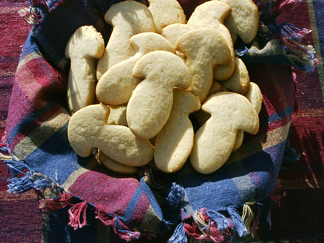 Either make the "fave dei morti" by taking pieces of the cookie dough and shaping them into large lima beans directly onto a greased cookie sheet, or (what I did) roll out the cookie dough on a floured wooden board to 1/4 inch, then using a "fava bean or mushroom shaped" cookie cutter cut out the cookies.