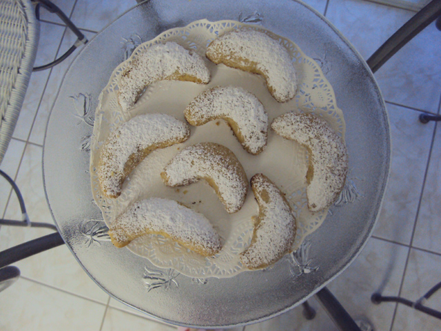 6. Remove from oven & spinkle wih a heavy coat of icing sugar while cookies are still hot. You can also roll them gently in the sugar taking care not to break the cookies.
