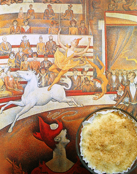 Notes This recipe was taken from "The Complete Italian Cook Book: La Cucina" by Rose L. Sorce. It was published by Grosset & Dunlap in 1953. For the entire copyright-free cookbook see www.archive.org.... Image [behind custard] Georges Scurat, Le cirque, 1891, |