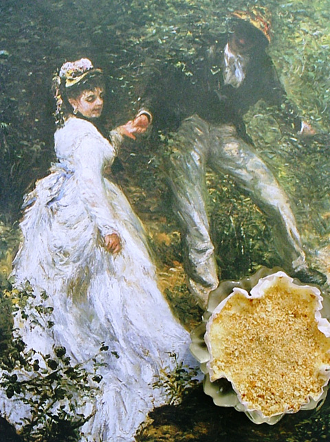 This recipe was first published in "The Italian Cookbook, 160 Masterpieces of Italian Cookery." It was put together by the staff home economists at the Culinary Arts Institute of Chicago (under the direction of Melanie De Proft). The book was first published by The Culinary Arts Institute (Chicago, Illinois)in 1954. Image [behind custard] Pierre-Auguste Renoir, La promenade, 1870. |